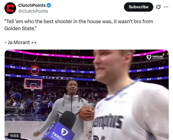 而在双方冲突被拉开后,莫兰特还在队友斯潘塞采访时,阴阳怪气暗讽克莱到:“告诉他们今晚最好的射手是谁!不是来自金州的那个家伙。”