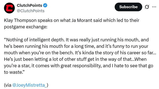 独行侠记者Landon Thomas赛后补刀到:“莫兰特说35岁的克莱是废物,然而26岁正值巅峰的自己本赛季投篮命中率35.9%,三分命中率16.7%。”