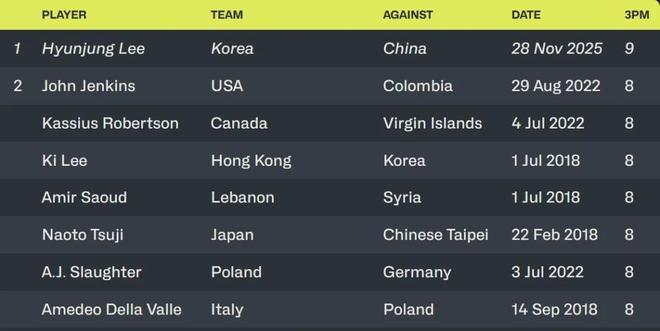 单场9记三分球,李贤重打破了世预赛单场命中三分球纪录,此前最高纪录为8记。