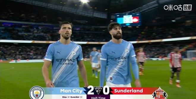 半场结束,曼城凭借两名中后卫各进一球,暂时主场两球领先桑德兰。